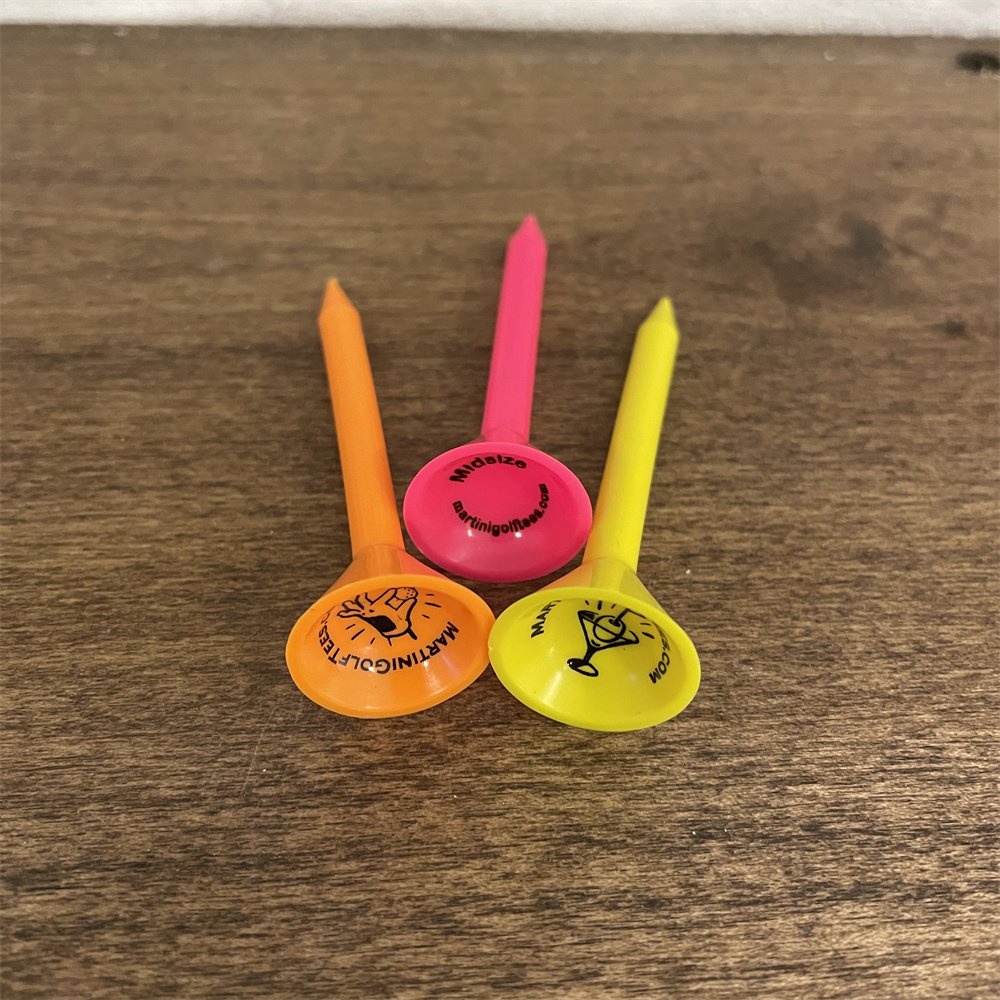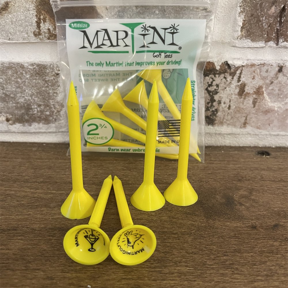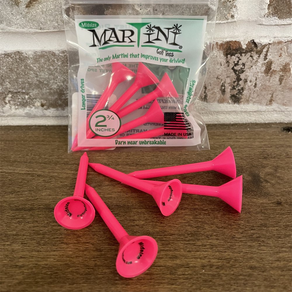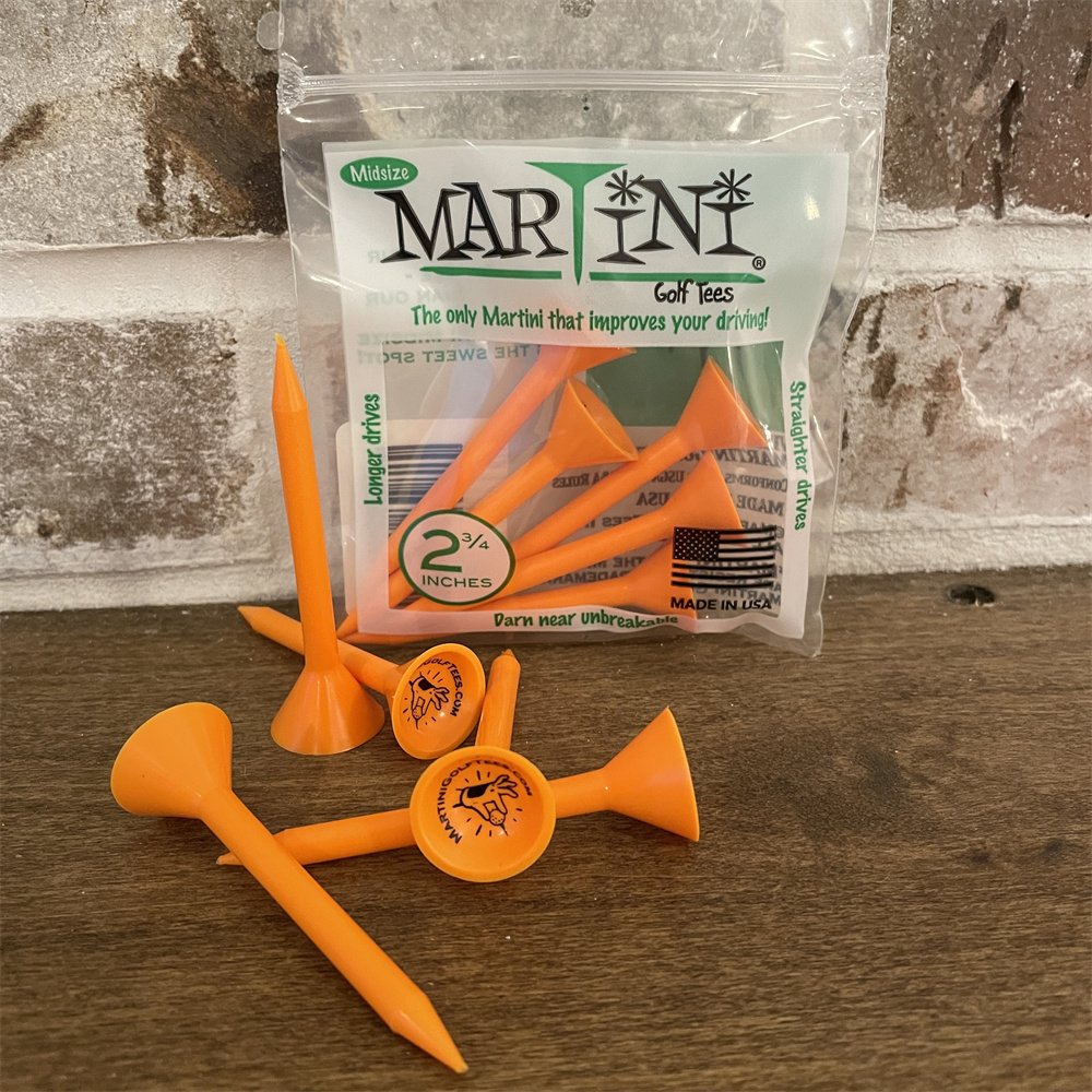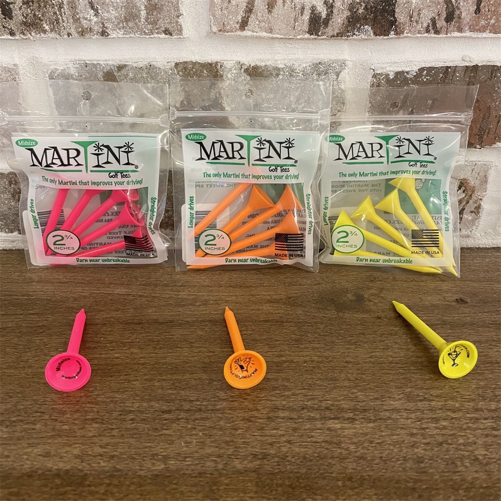 Martini Golf TeesTee Size: 2.75”Martini Mid Size Tees are the “one size fits all” solution. Hits the sweet spot between the Original and the Martini 2, the midsize travels anywhere and is adjustable in height under any tee box conditions.